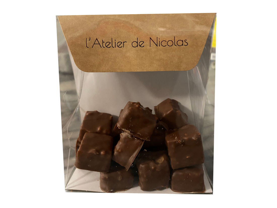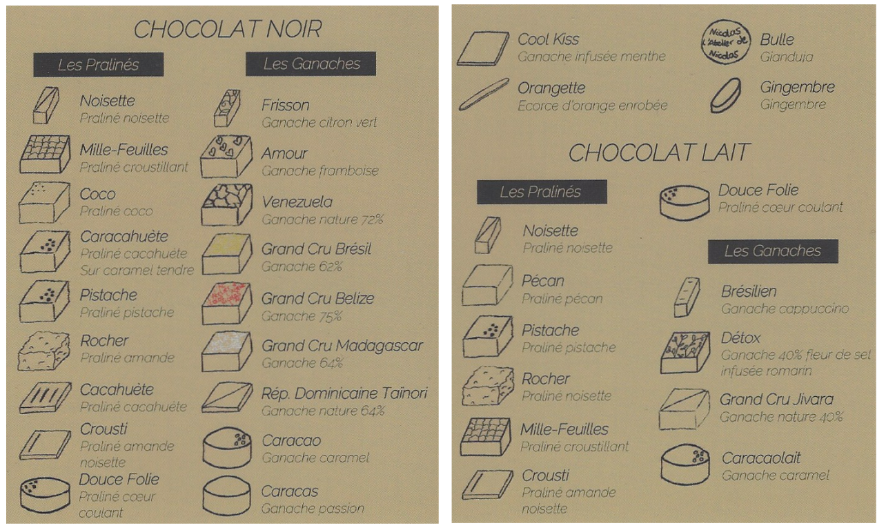 Nos chocolats se conservent 15 jours, nos pâtes à tartiner praliné noisette et praliné pistache10 jours et la pâte à tartiner20 jours. La température doit être entre 16 et 19 degrés.