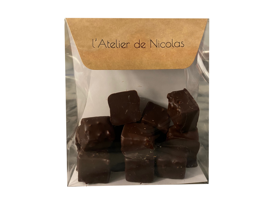 Tous nos chocolats sont réalisés à la main. Chaque boîte contient un mélange de différents chocolats pralinés et ganaches au lait, noir ou noir/lait.